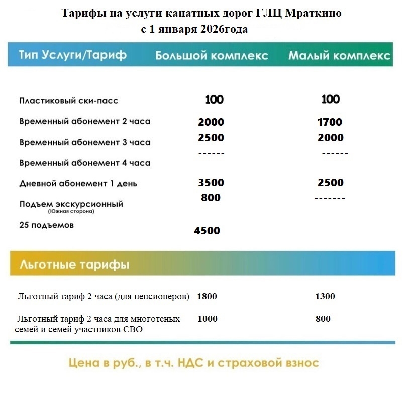 Стоимость скипасса и тарифы на услуги ГЛЦ Мраткино. Источник: vk.com/glk_mratkino